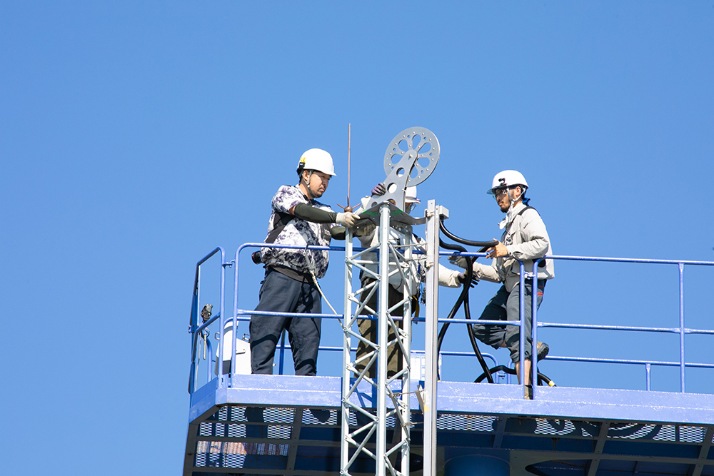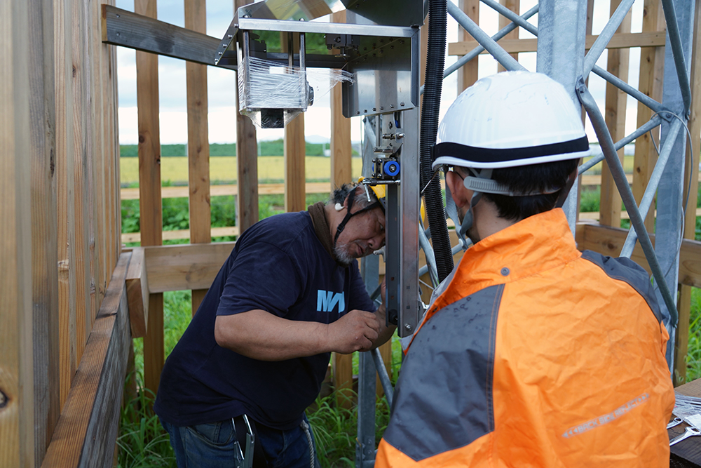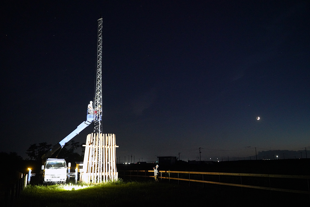 5月より制作を開始。川俣さんの制作チーム(鈴木雄介、野地真隆、深野元太郎)と地元工務店により、鉄塔や映像を見るためのモニターのための基礎工事、鉄塔を施工
