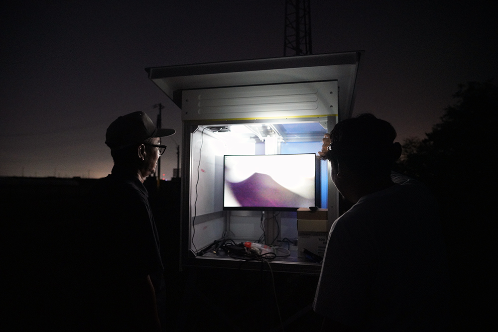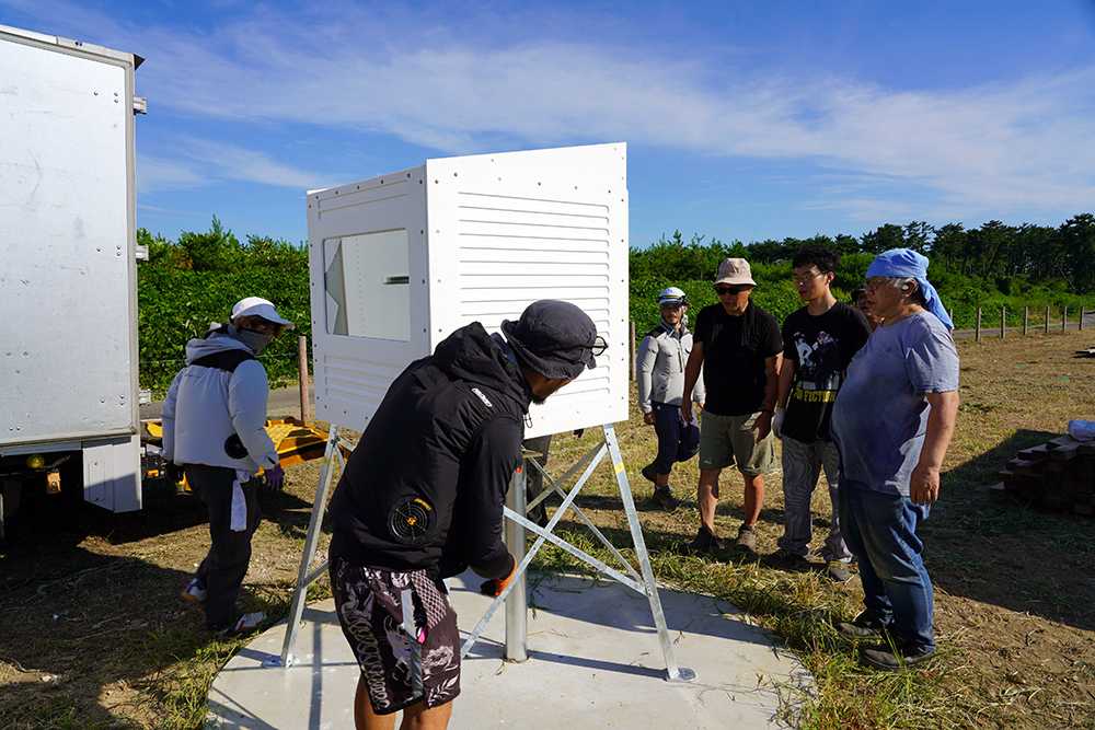 汎用動力研究所(牛島達治、八木温生、何 梓羽)の3人も29日に現場入り。写真は、映像を見るための百葉箱を模したモニター