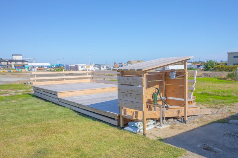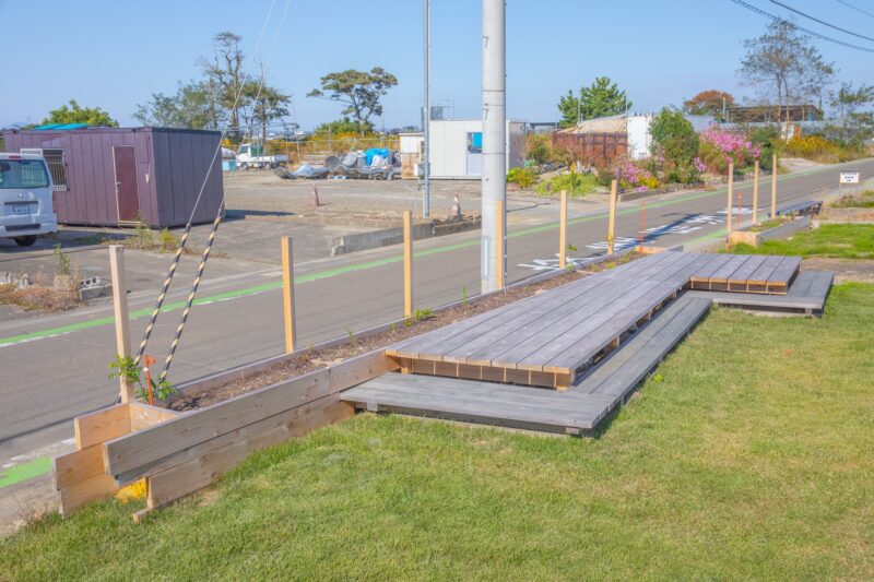 《井土浜パーゴラ》の立地場所に、井土地区の住民や訪れる人々が過ごし、さまざまなアクティビティを誘うテラスを制作。道路側のテラスには花壇も設置されている。また、東日本大震災前にもともとあった井戸を新たな形で再生させた。